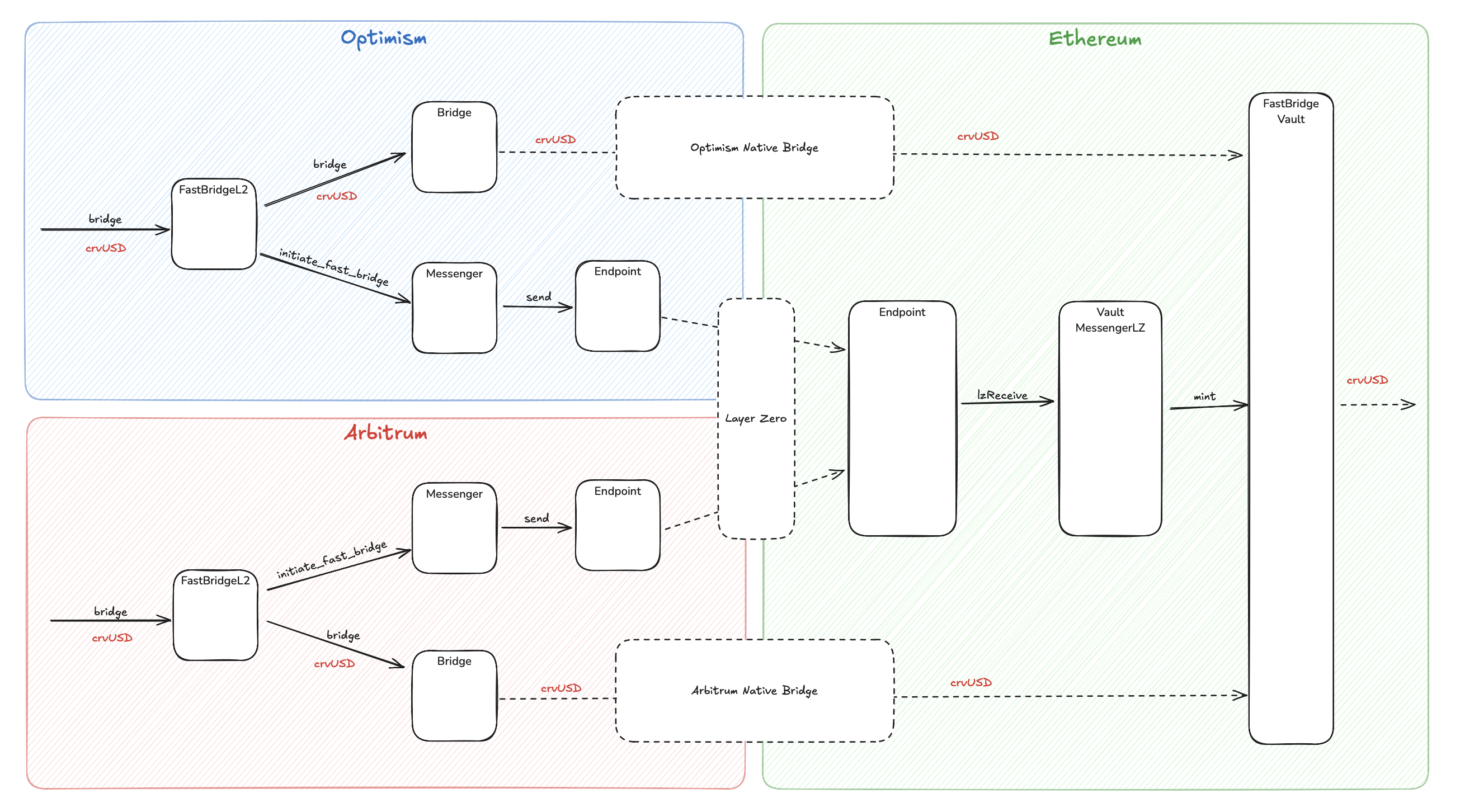 FastBridge is a workaround solution for the 7-day delay from L2 native bridges by pre-minting crvUSD. This system enables fast cross-chain transfers of crvUSD from Layer 2 networks (Arbitrum, Optimism, Fraxtal) to Ethereum mainnet.
